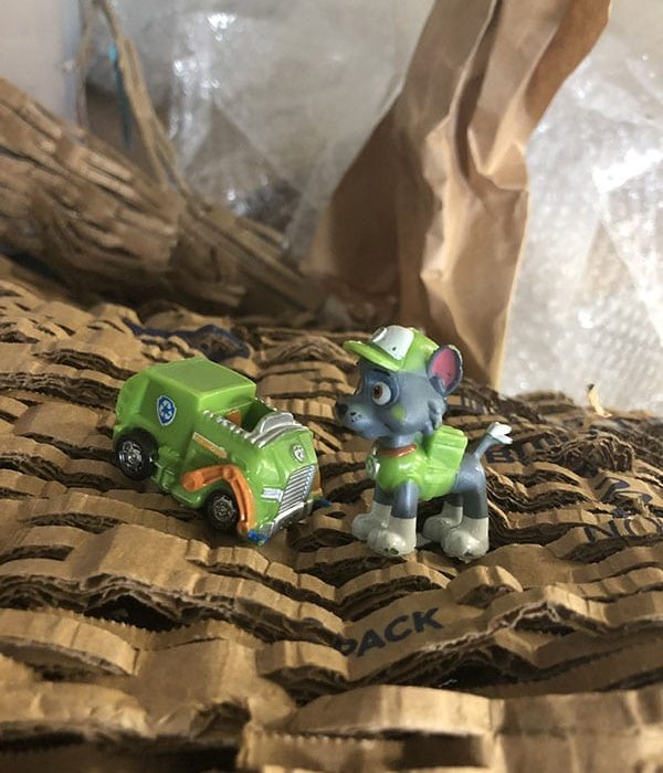 Vi ved godt, at det måske ikke ser så pænt ud, som vores sædvanlige papkasser, men vi håber at I kan se igennem fingrene med det, når I ved at “Genbrug er god brug”