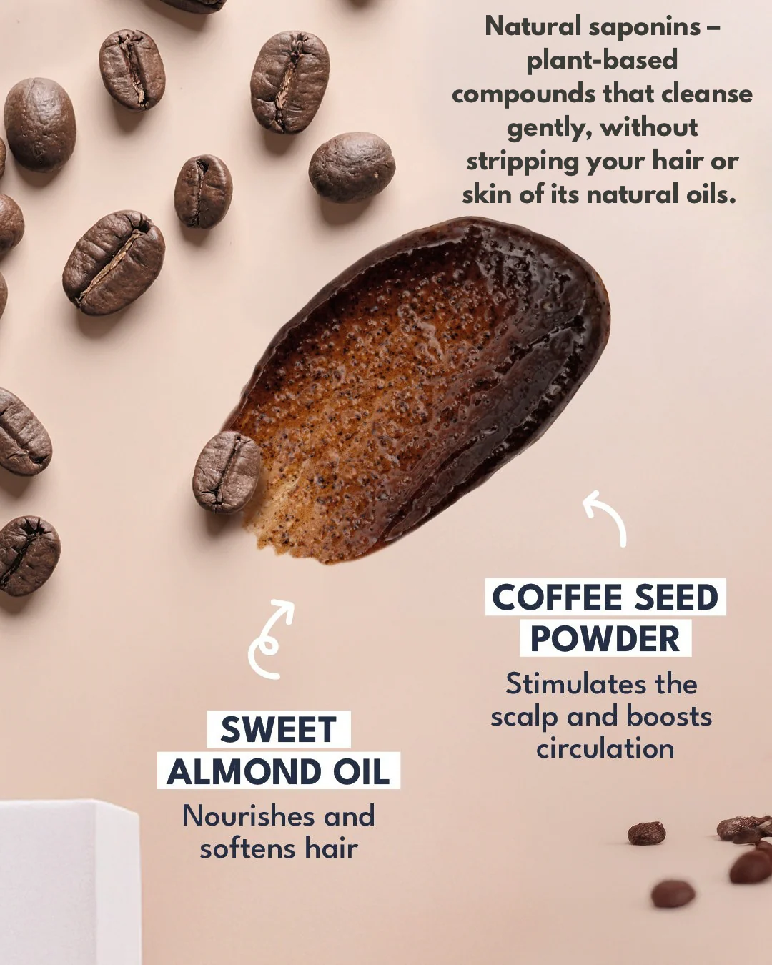 Økologisk Kaffegranulat (Coffea Arabica Seed Powder): Kaffens korn er den naturlige, blide eksfoliant, der effektivt fjerner buildup. Koffein er desuden kendt for at være en potent antioxidant, der stimulerer mikrocirkulationen i hovedbunden. Dette er afgørende for at forlænge vækstfasen af håret.